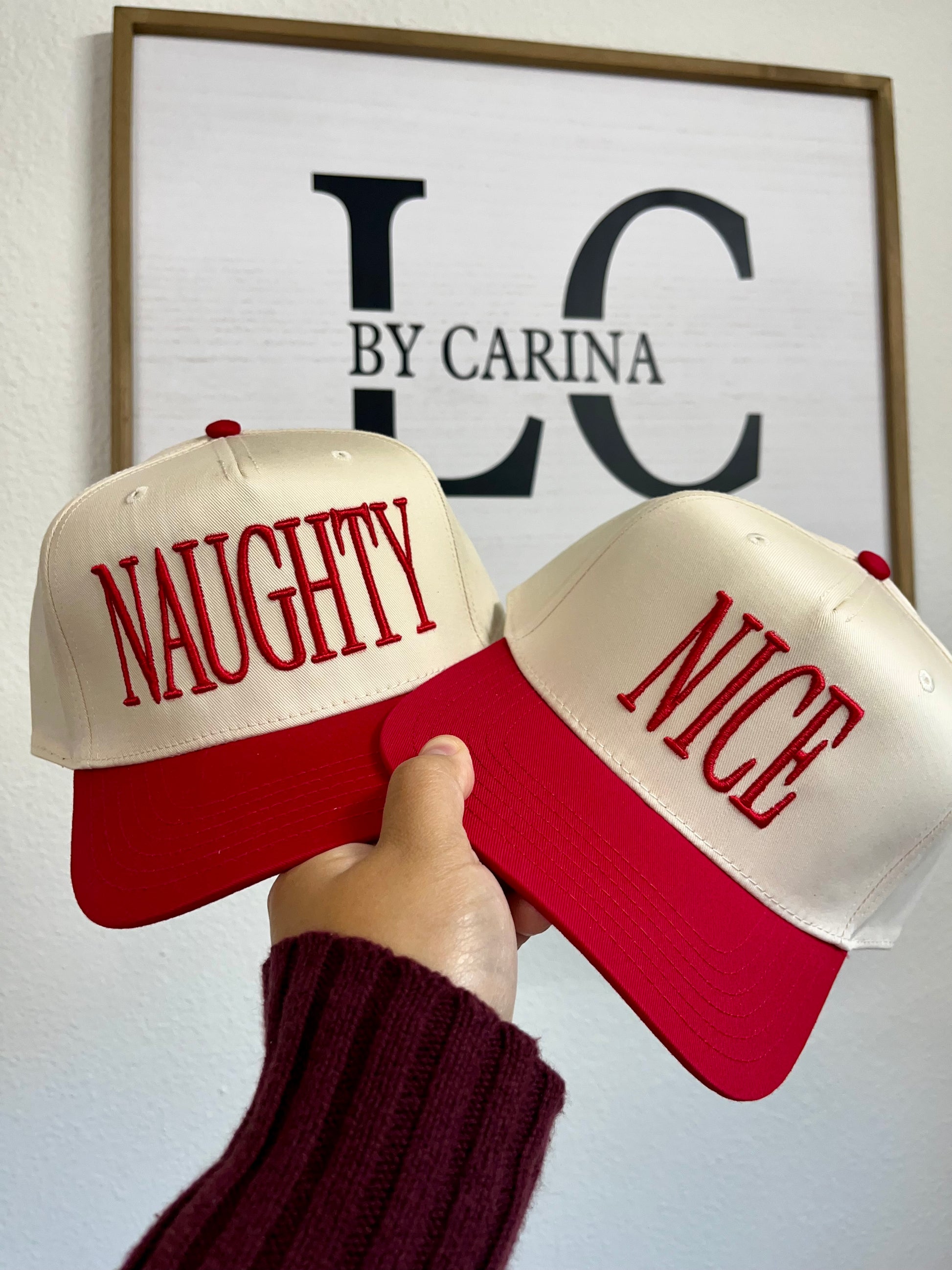 Whether you’re feeling festive or a little mischievous, these embroidered holiday trucker hats have you covered! Choose between “NICE” or “NAUGHTY” — both feature bold red lettering on a cream front with a red brim. Fun, playful, and perfect for holiday parties, gift exchanges, or just spreading cheer all season long.